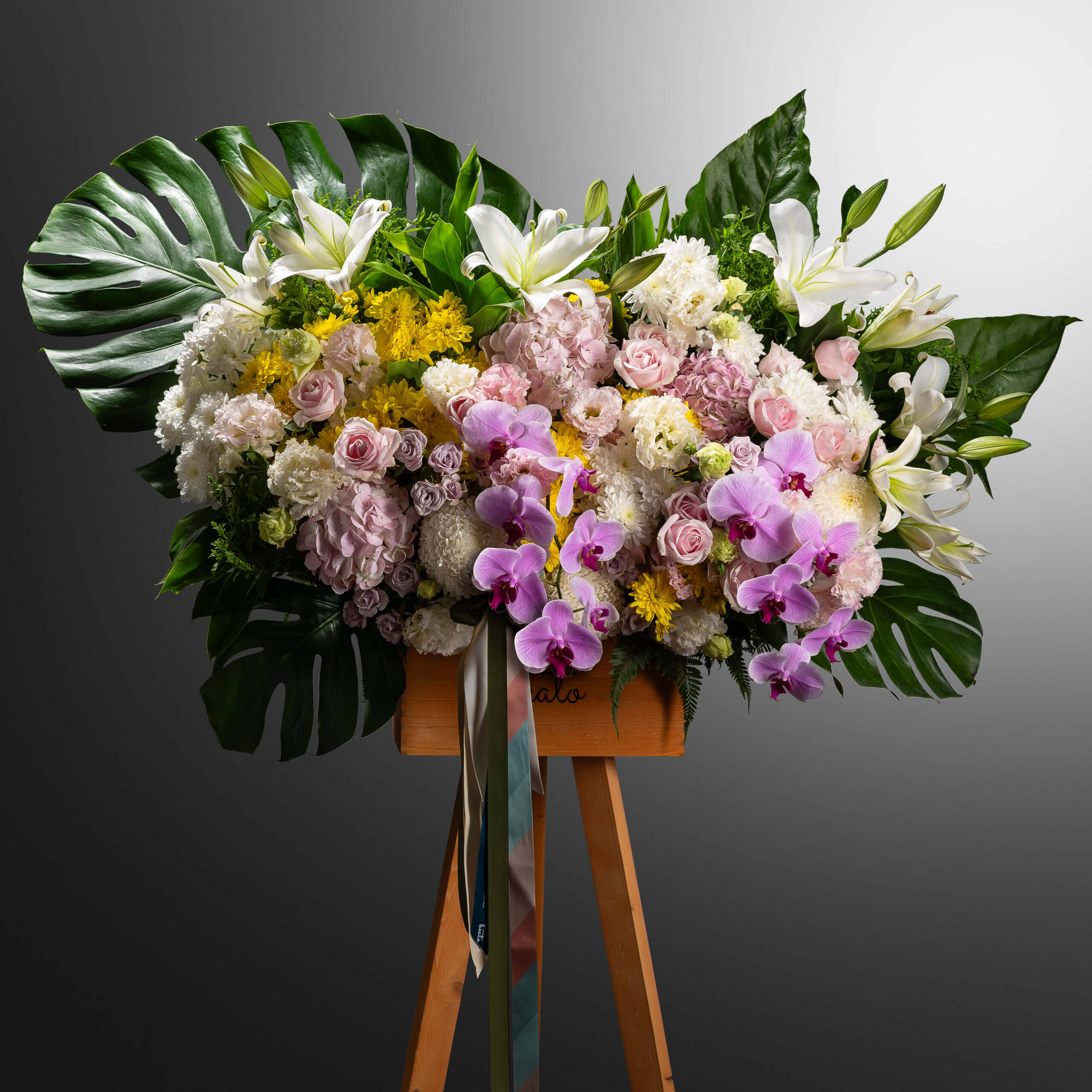 Introducing “Cloud Full of Stars,” a bereavement flower stand that honors loved ones with a gentle and serene tribute. This exquisite arrangement features Pom Pom, Chrysanthemum Sunlight, and Rose, alongside Rosespray, Hydrangea, Lily, and Eustoma. Phalaenopsis adds an elegant touch, complemented by Monstera, Jungle Bush, and Johore Fern. “Cloud Full of Stars” provides a heartfelt expression of sympathy, perfect for funerals and memorial services.