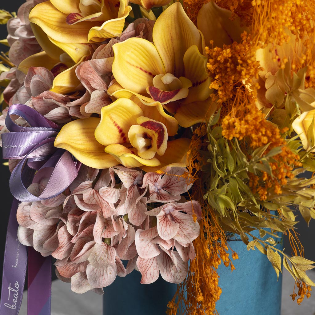 Introducing “Essence of Sol,” a Silk & Preserved Flower Art arrangement that radiates the warmth and brilliance of the sun. This exquisite arrangement features Silk Cymbidium and Silk Hydrangea, complemented by Preserved Ruscus and Broom Press. Crafted from premium silk and preserved materials, “Essence of Sol” offers enduring beauty with minimal maintenance, making it perfect for gifts, home decor, housewarming presents, office spaces, and special occasions. Its versatile design ensures it can brighten any environment, bringing a touch of natural warmth and aesthetic charm.