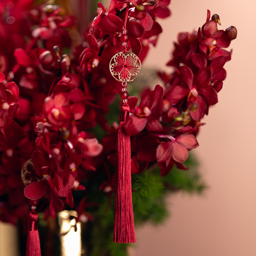 Longevity: Fresh Cut Flowers: 3–5 days; CNY Tassel and Vase: Eternal