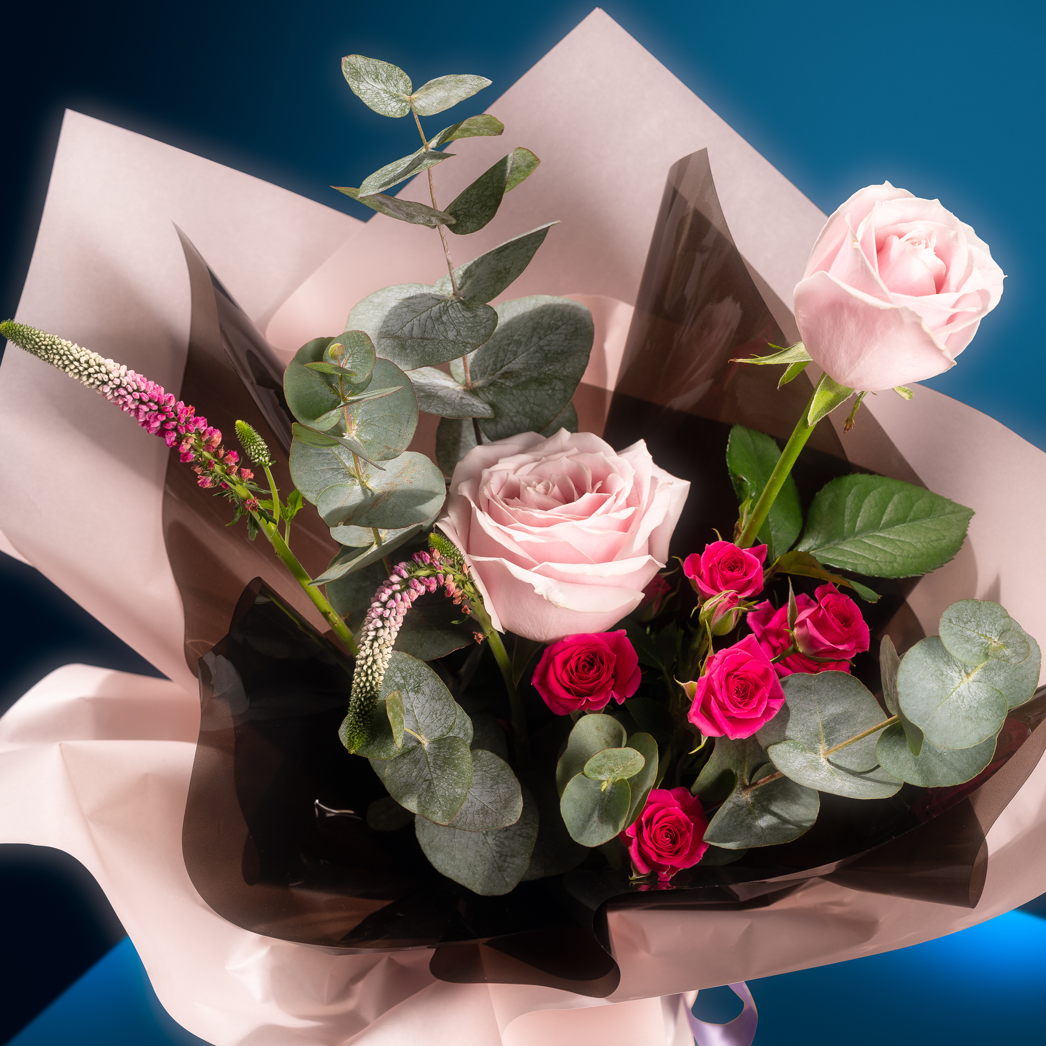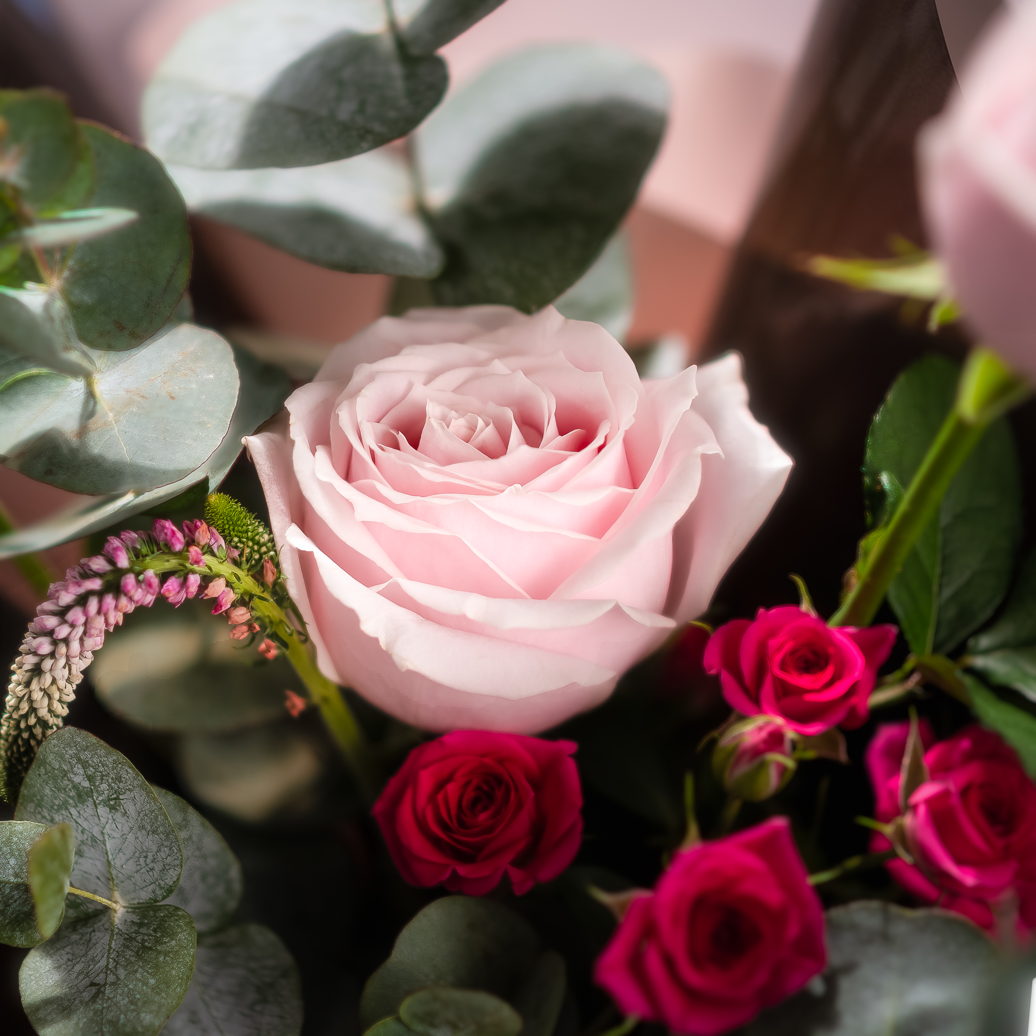 Materials: 2 Stalks Light Pink rose, 1 stalk Rose spray hot pink, Veronica pink, Eucalyptus