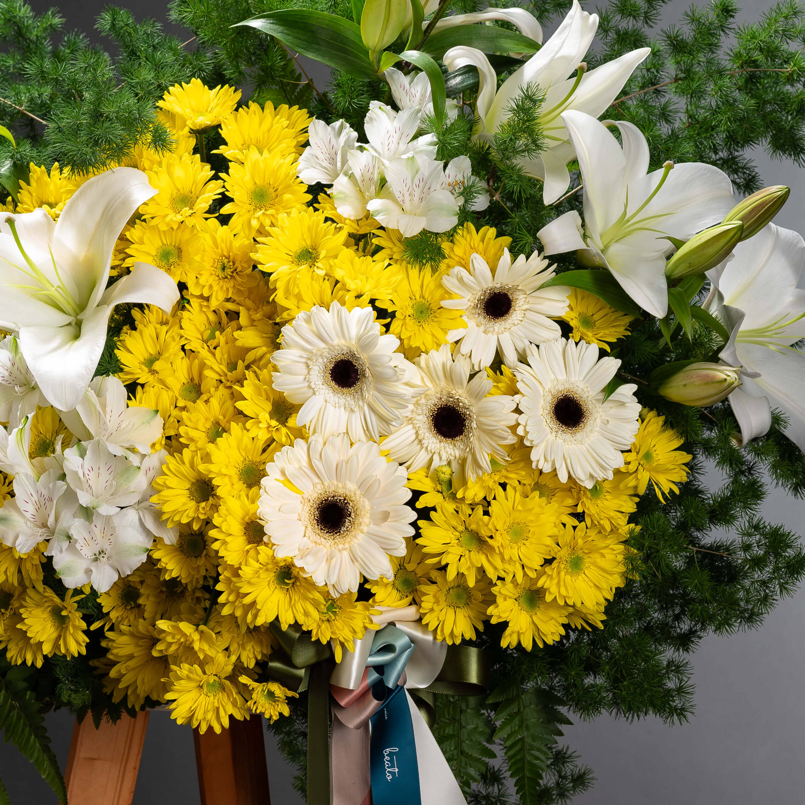 Introducing “Spire of Land Beyond,” a bereavement flower stand that serves as a dignified tribute to honor and remember those who have passed. This elegant arrangement features Chrysanthemum Pom Pom, Eustomas Double, and Anthurium, complemented by Rose Tineke and Caspia Misty Blue. Accented with Caspia, Ming Fern, and Johor Fern, “Spire of Land Beyond” provides a serene and respectful expression of sympathy, perfect for funerals and memorial services.