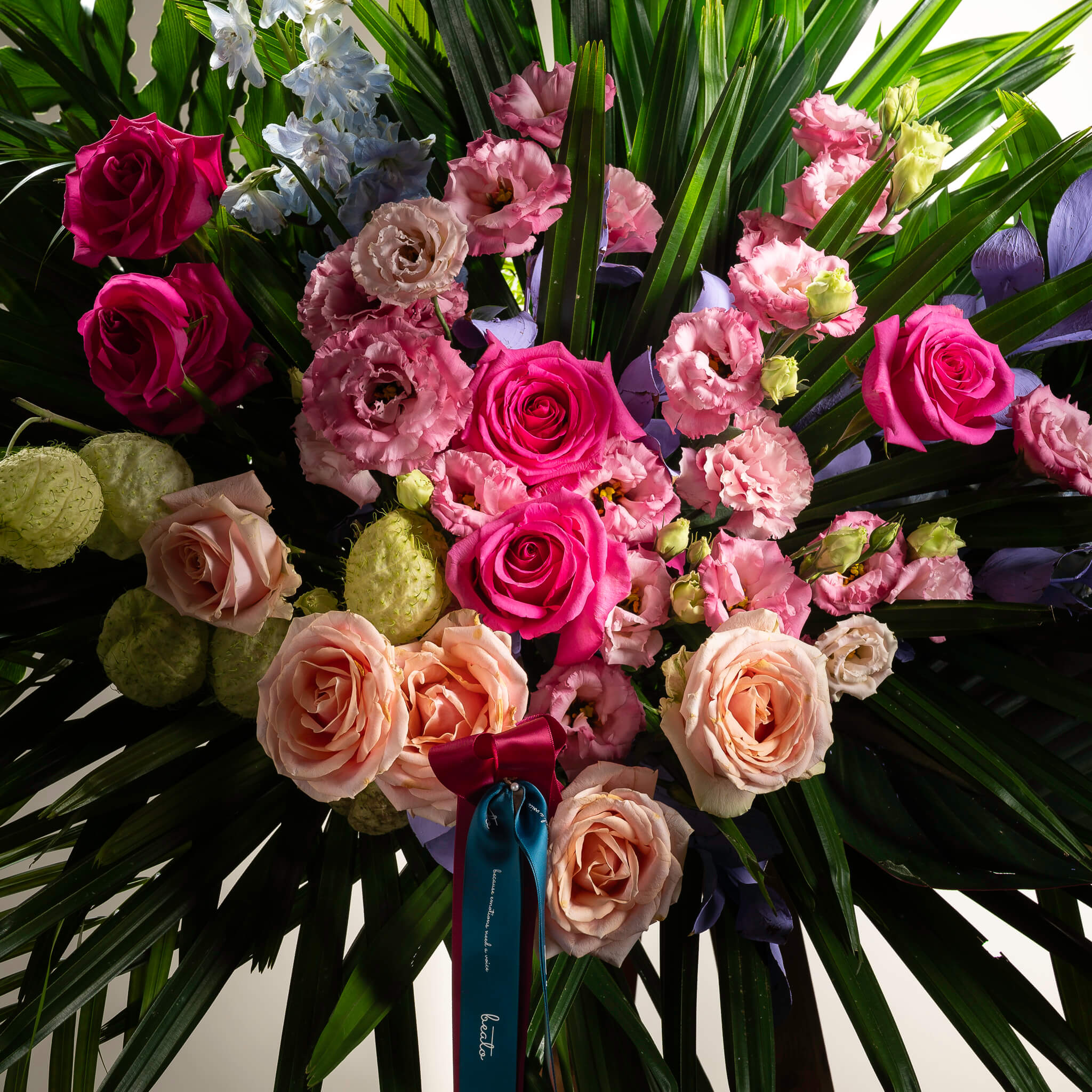 Introducing “The Fatebringer,” a celebration flower stand that symbolizes destiny and triumph. This striking arrangement features the elegant Kenya Rose and delicate Eustomas, complemented by the vibrant Delphinium and unique Fruiticosa. Finger Palm and Red Wing add dynamic elements, while Philodendron Xanadu, Dyed Ruscus, and Yellow Palm bring lush textures. “The Fatebringer” is perfect for grand openings, corporate milestones, and celebrations of significant achievements.