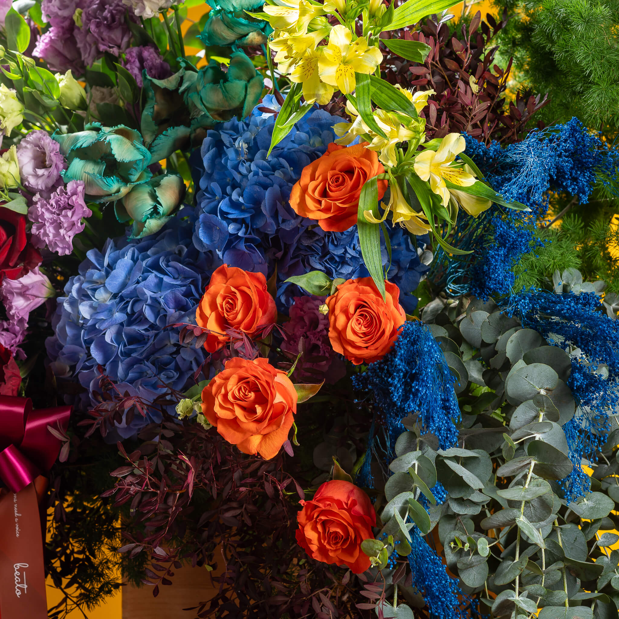 Introducing “Through Lens of Fate,” a celebration flower stand that embodies the journey of destiny and triumph. This captivating arrangement features the lush beauty of Hydrangea, the delicate charm of Eustoma, and the timeless elegance of Roses. Alstroemeria adds vibrant accents, while Palm Cap and Preserve Broom bring unique textures. Mint Fern, Pistacia, Eucalyptus, and Johore Fern complete this enchanting display. “Through Lens of Fate” is perfect for grand openings, corporate milestones, and celebrations of significant achievements, symbolizing the path of destiny.